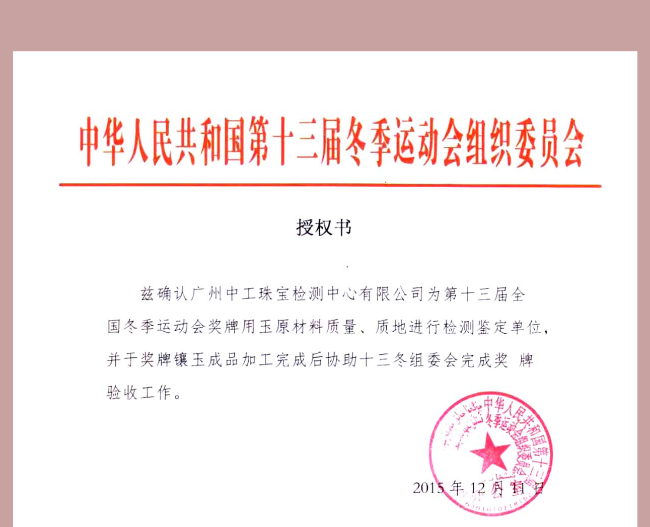 中工珠寶檢測中心成立于2013年, 是經質量技術監督局認證并獲得中國國家認證認可監督管理委員會資質認定及計量認證證書、中國合格評定國家認可委員會認可的國家珠寶檢測機構,并得到國際實驗室認可合作組織 (ILAC-MRA)認可,本中心是中華人民共和國第十三屆冬季運動會獎牌玉環獨家檢測單位。