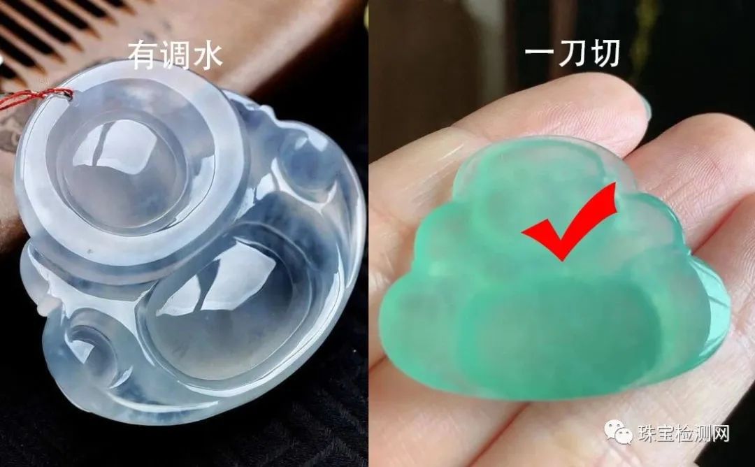 買(mǎi)吊墜時(shí)可以看一看吊墜的反面,如果背面是一刀切,說(shuō)明這件吊墜的料子十分完美,玉雕師對(duì)料子很自信,即便不調(diào)水,也能展示出優(yōu)秀的種水。