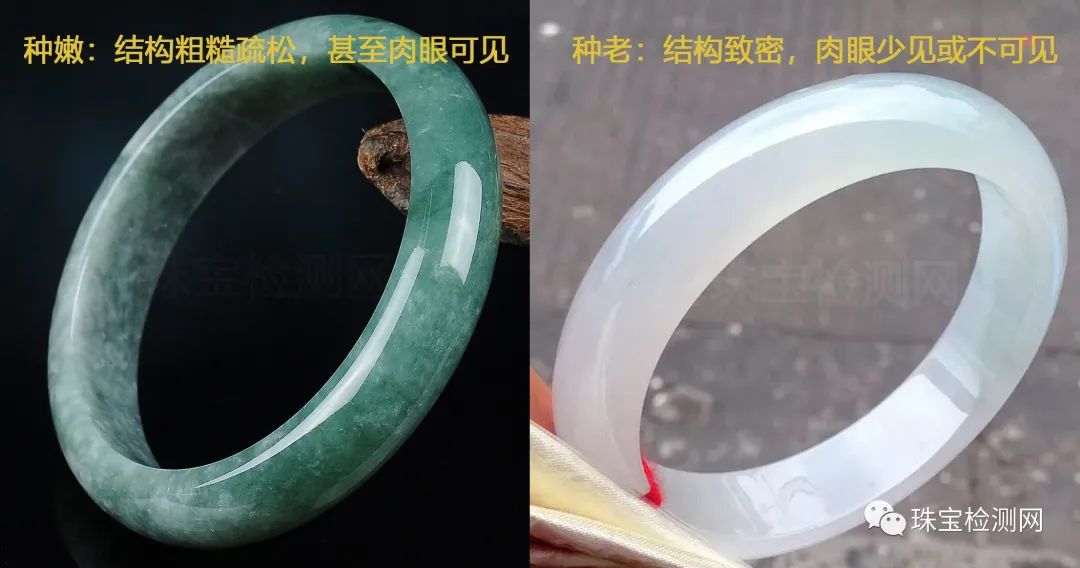 翡翠種嫩,內(nèi)部的結(jié)構(gòu)會(huì)比較粗糙,顆粒與顆粒之間的間隔也比較大。